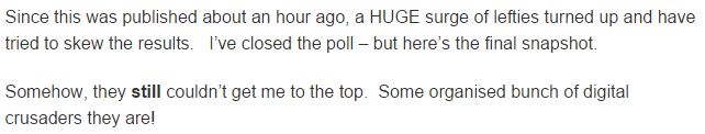 Slater rejects people of a particular political persuasion being entitled to an opinion on his poll so he could skew the results.